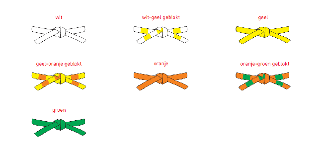 (wit) tot 3de kyu (groen). Daarna traint men mee met de volwassenen.
